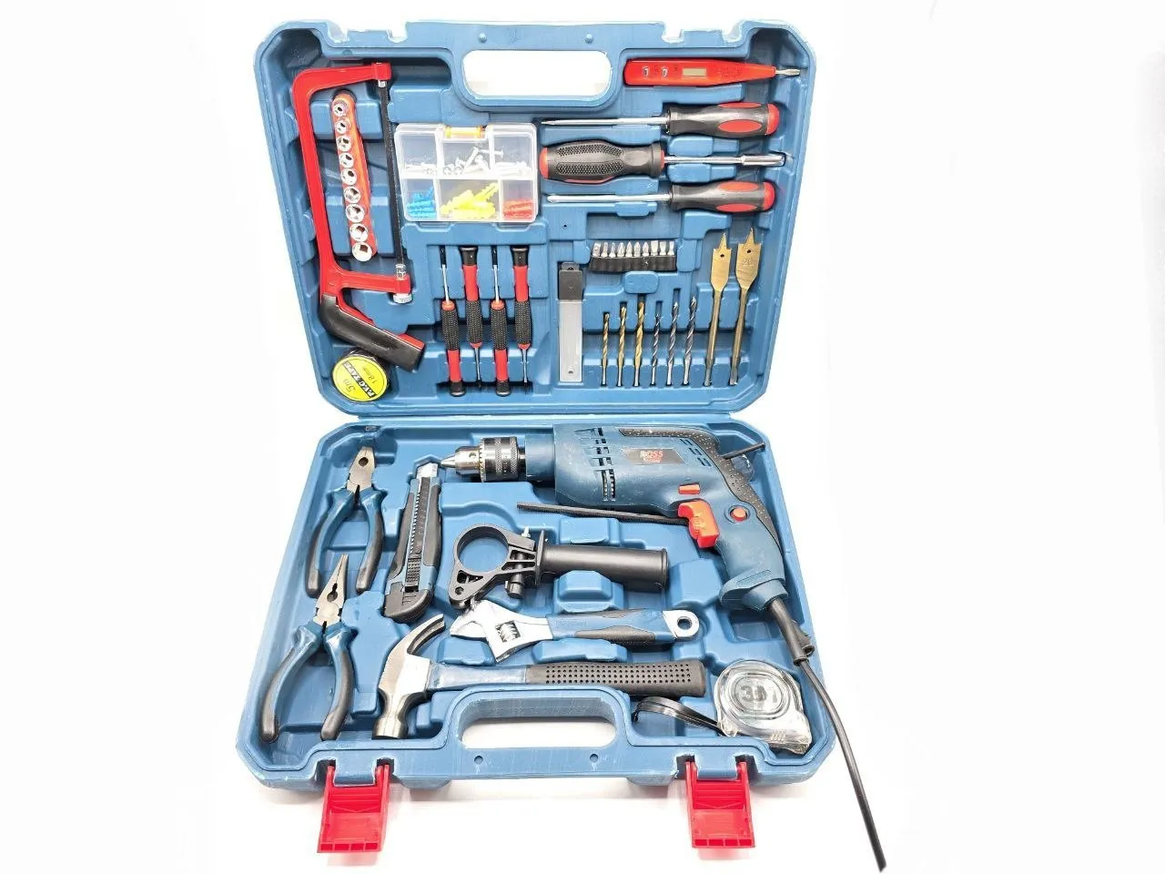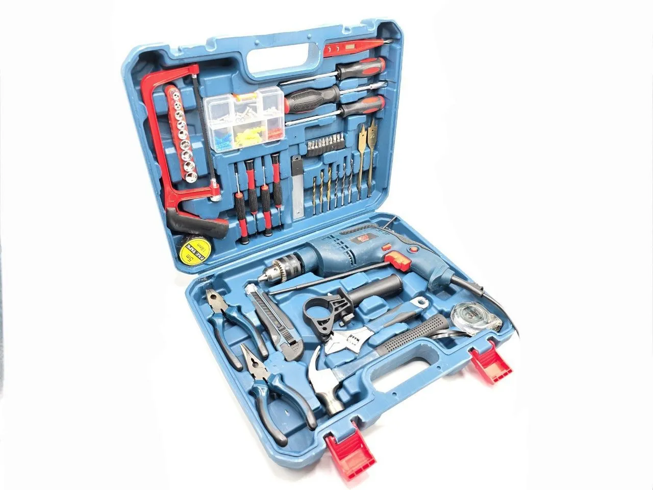 ✔️ دارای کلیه ابزارهای مصرفی شامل؛ آچار فرانسه سایز۸، انبردست، دمباریک، چکش، بکس تک سایز ۴ تا ۱۳، متر ۳ متری، پیچ گوشتی دوسو و چهارسو سایز بزرگ، پیچ گوشتی نوک خور، مته آهن سایز ۵ و ۶ و ۸، مته دیوار سایز ۵ ،۶ و ۸، مته برگی سایز ۱۲ و ۱۶، ۹ عدد نوک پیچ گوشتی، تبدیل نوک پیچ گوشتی به بکس چسب برق، کاتر، فازمتر دیجیتال، آچار سه نظام، ۵ عدد تیغ کاتر، دو سایز پیچ گوشتی موبایلی دو سو و دو سایز پیچ گوشتی موبایلی چهارسو، کمان اره چوب و فلز، مجموعه سایزبندی پیچ و رولپلاک